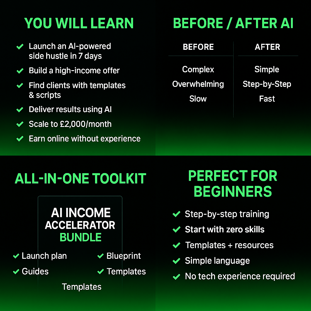 The AI Income Accelerator Bundle gives you everything you need to start earning online using Artificial Intelligence — with zero experience, zero guesswork, and zero overwhelm.